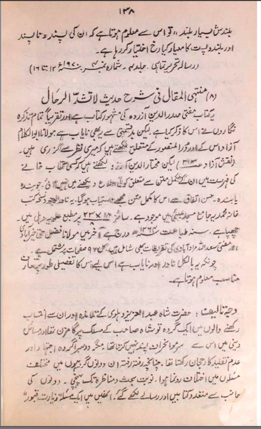 এখানে উলামায়ে কেরামের জন্য মুনতাহাল মাকালের ভূমিকার কিছু স্ক্রিনশট দেয়া হলো। হিন্দুস্তানের ইতিহাস পড়লে অবাক হতে হয়। প্রাচীন উলামায়ে কেরাম সমস্যার মূল চিহ্নিত করে অত্যন্ত বলিষ্ঠভাবে সেটি খন্ডন করেছেন। এ অঞ্চলের সমস্ত ফেতনার গোড়া যে ইবনে তাইমিয়া ও ইবনে আব্দিল ওয়াহহাবের মতাদর্শের কারণে হয়েছে, তারা খুব স্পষ্ট ভাষায় বলে গিয়েছেন। কিন্তু দু:খজনক বিষয় হলো, আমরা আমাদের প্রাচীন এই তুরাস থেকে বিমুখ হয়ে নজদী-তাইমীদের ভ্রষ্টতায় গা ভাসিয়ে দিয়েছি। আল্লাহ তায়ালা আমাদেরকে হেফাজত করুন।