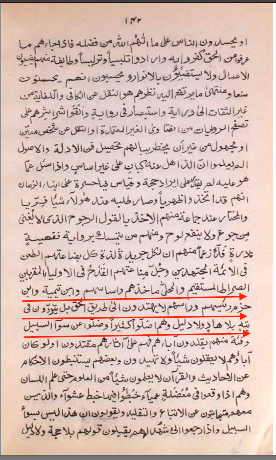 "বর্তমানে কিছু লোক বের হয়েছে যাদের মূল কাজ হলো মুজতাহিদ ইমামগণের উপর আক্রমণ করা। ওলী-বুজুর্গদের সমালোচনা ও তুচ্ছ-তাচ্ছিল্য করা। ইবনে তাইমিয়ার ইকতিদাউস সিরাতিল মুস্তাকিম ও ইবনে হাজামের আল-মুহাল্লা এদের মূল সম্বল। আর ইবনে তাইমিয়া এবং ইবনে হাজম হলো এই দলের মূল ও কেন্দ্রবিন্দু। এরা সঠিক পথ থেকে বিচ্যূত হয়ে ভ্রান্তির বেড়াজালে ঘুরপাক খায়। এদের না আছে কোন দলিল না আছে কোন সঠিক পথপ্রদর্শক। এভাবে তারা বহু মানুষকে গোমরাহ করছে এবং নিজেরাও পথভ্রষ্ট হয়েছে।"