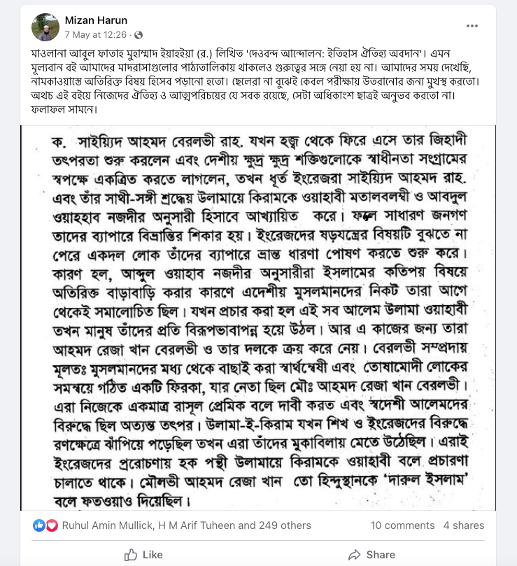 চলুন, মিজান হারুনের সাম্প্রতিক একটি পোস্ট নিয়ে আলোচনা শুরু যাক। মিজান হারুন মাওলানা আবুল ফাতাহ মুহাম্মাদ ইয়াহইয়া লিখিত কওমী মাদ্রাসার মেশকাত জামাতের (দাওরা হদীসের নিচের জামায়াত) এর নেসাবভুক্ত দেওবন্দ আন্দোলন ইতিহাস ঐতিহ্য অবদান নামক কিতাব একটি অংশ স্ক্রিনশট দিয়ে লিখেছেন,