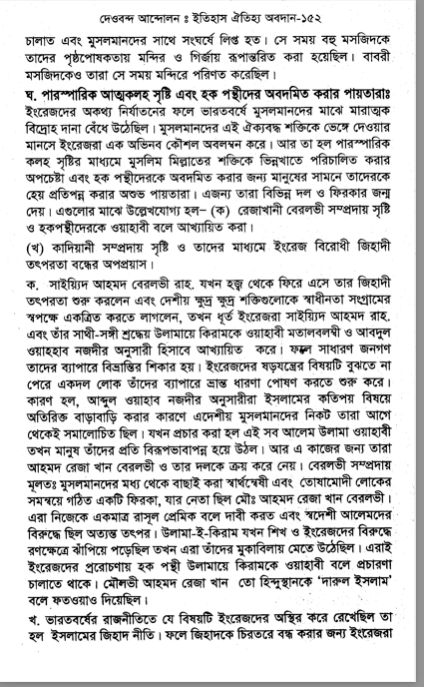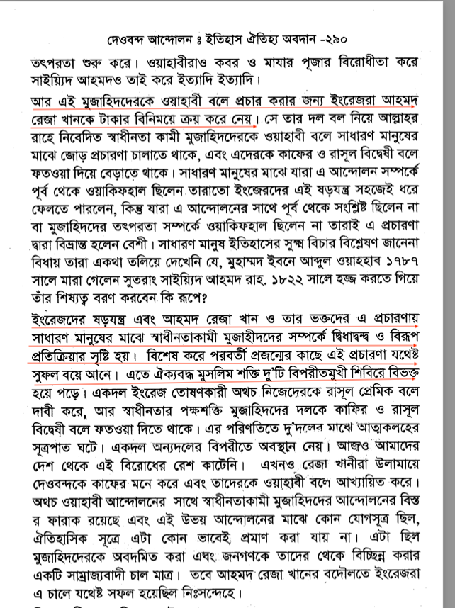 সাইয়্যিদ আহমাদ বেরলভী রাহ: যখন হজ্ব থেকে ফিরে এসে তার জিহাদী তৎপরতা শুরু করলেন এবং দেশীয় ক্ষুদ্র ক্ষুদ্র শক্তিগুলোকে স্বাধীনতা সংগ্রামের স্বপক্ষে একত্রিত করতে লাগলেন, তখন ধূর্ত ইংরেজরা সাইয়্যিদ আহমাদ রাহ: এবং তার সাথী-সঙ্গী শ্রদ্ধেয় উলামায়ে কেরামকে ওয়াহাবী মতালম্বী এবং এবং আব্দুল ওয়াহহাব নজদীর অনুসারী হিসেবে আখ্যায়িত করে। ফলে সাধারণ জনগণ তাদের ব্যাপারে বিভ্রান্তির শিকার হয়। ইংরেজদের ষড়যন্ত্রের বিষয়টি বুঝতে না পেরে একদল লোক তাদের ব্যাপারে ভ্রান্ত ধারণা পোষণ করতে শুরু করে। কারণ হলো, (মুহাম্মাদ বিন) আব্দুল ওয়াহহাব নজদীর অনুসারীরা ইসলামের কতিপয় বিষয়ে অতিরিক্ত বাড়াবাড়ির কারণে এদেশীয় মুসলমানদের নিকট তারা আগে থেকেই সমালোচিত ছিলো। যখন প্রচার করা হলো এই সব আলিম উলামা ওয়াহাবী, তখন মানুষ তাদের প্রতি বিরুপভাবাপন্ন হয়ে ওঠল। আর একাজের জন্য তারা আহমাদ রেজা খান বেরলভী ও তার দলকে ক্রয় করে নেয়। বেরেলভী সম্প্রদায় মূলত: মুসলমানদের মধ্য থেকে বাছাই করা স্বার্থান্বেষী এবং তোষামোদী লোকের সমন্বয়ে গঠিত একটি ফেরকা, যার নেতা ছিল মৌ: আহমাদ রেজা খান বেরলভী। এরা নিজেকে একমাত্র রাসূল প্রেমিক বলে দাবী করত এবং স্বদেশী আলিমদের বিরুদ্ধে ছিলো অত্যন্ত তৎপর। উলামায়ে কেরাম যখন শিখ ও ইংরেজদের বিরুদ্ধে রণক্ষেত্রে ঝাঁপিয়ে পড়েছিল তখন এরা তাদের মুকাবিলায় মেতে ওঠেছিল। এরাই ইংরেজদের প্ররোচণায় হক্বপন্থী উলামায়ে কেরামকে ওয়াহাবী বলে প্রচারণা চালাতে থাকে। মৌলভী আহমাদ রেজা খান তো হিন্দুস্তানকে ‘দারুল ইসলাম’ বলে ফতওয়াও দিয়েছিল।”