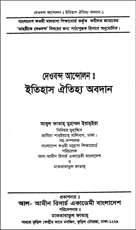 “ মাওলানা আবুল ফাতাহ মুহাম্মাদ ইয়াহইয়া (র.) লিখিত 'দেওবন্দ আন্দোলন: ইতিহাস ঐতিহ্য অবদান'। এমন মূল্যবান বই আমাদের মাদরাসাগুলোর পাঠ্যতালিকায় থাকলেও গুরুত্বের সঙ্গে নেয়া হয় না। আমাদের সময় দেখেছি, নামকাওয়াস্তে অতিরিক্ত বিষয় হিসেব পড়ানো হতো। ছেলেরা না বুঝেই কেবল পরীক্ষায় উতরানোর জন্য মুখস্থ করতো। অথচ এই বইয়ে নিজেদের ঐতিহ্য ও আত্মপরিচয়ের যে সবক রয়েছে, সেটা অধিকাংশ ছাত্রই অনুভব করতো না। ফলাফল সামনে।”