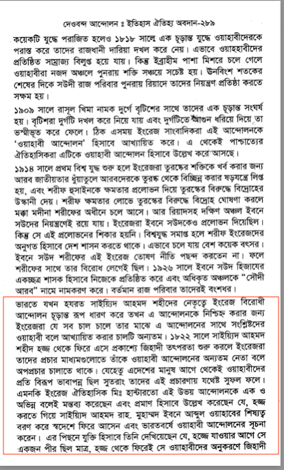এরপর তিনি ধারাবাহিকভাবে আহমাদ রেজাখানের দারুল হারব ও দারুল ইসলাম ফতোয়া নিয়ে সমালোচনা চালিয়ে যেতে থাকেন। ২৮৭ পৃষ্ঠায় তিনি ‘ওয়াহাবী অপবাদের নেপথ্য কাহিনী’ শিরোনামে আলোচনা শুরু করেন। এই আলোচনায় তিনি শুরুতে মুহাম্মাদ বিন আব্দুল ওয়াহহাব নজদীকে সংগ্রামী সংস্কারক হিসেবে উল্লেখ করে নজদীদের ইতিহাস সংক্ষেপে তুলে ধরেছেন। ওয়াহাবীদের ইতিহাস আলোচনা করার পর তিনি আবার আহমাদ রেজা খানের আলোচনায় ফিরে এসেছেন ২৮৯ পৃষ্ঠায়। এখানে তিনি লিখেছেন,