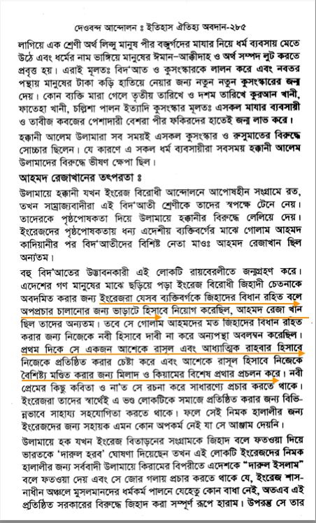 এই কিতাবের ২৮৭ পৃষ্ঠায় আহমদ রিদ্বা খান ও তার অনুসারীদের সম্পর্কে তিনি লিখেছেন,