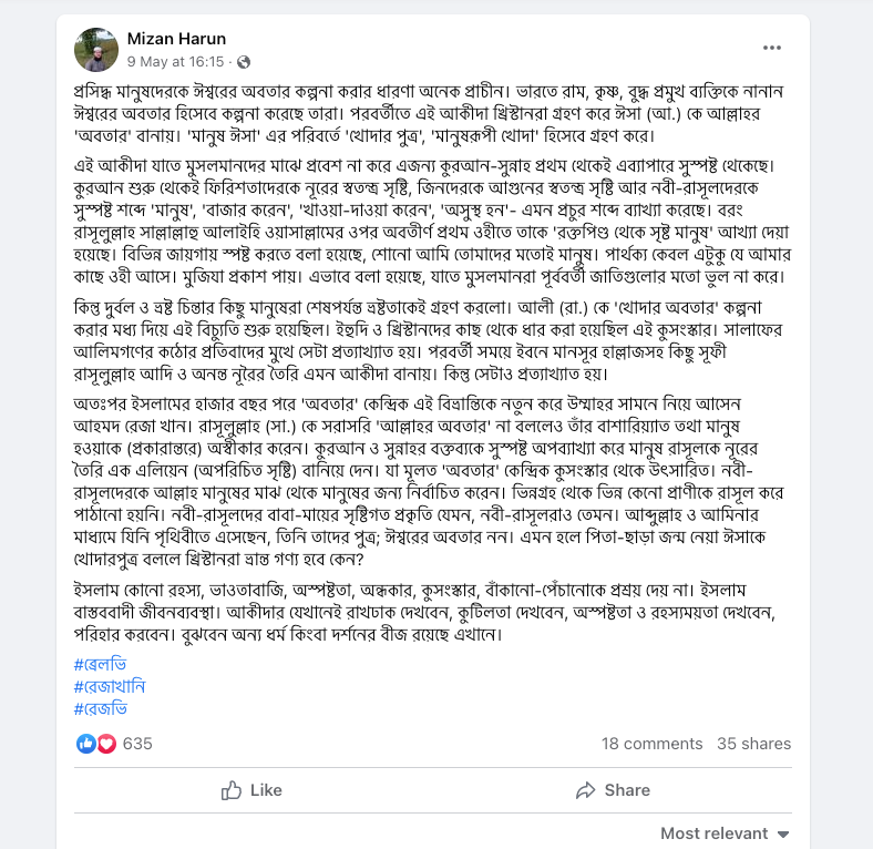 “রাসূলুল্লাহ (সা.) কে সরাসরি 'আল্লাহর অবতার' না বললেও তাঁর বাশারিয়্যাত তথা মানুষ হওয়াকে (প্রকারান্তরে) অস্বীকার করেন। কুরআন ও সুন্নাহর বক্তব্যকে সুস্পষ্ট অপব্যাখ্যা করে মানুষ রাসূলকে নূরের তৈরি এক এলিয়েন (অপরিচিত সৃষ্টি) বানিয়ে দেন। যা মূলত 'অবতার' কেন্দ্রিক কুসংস্কার থেকে উৎসারিত।”