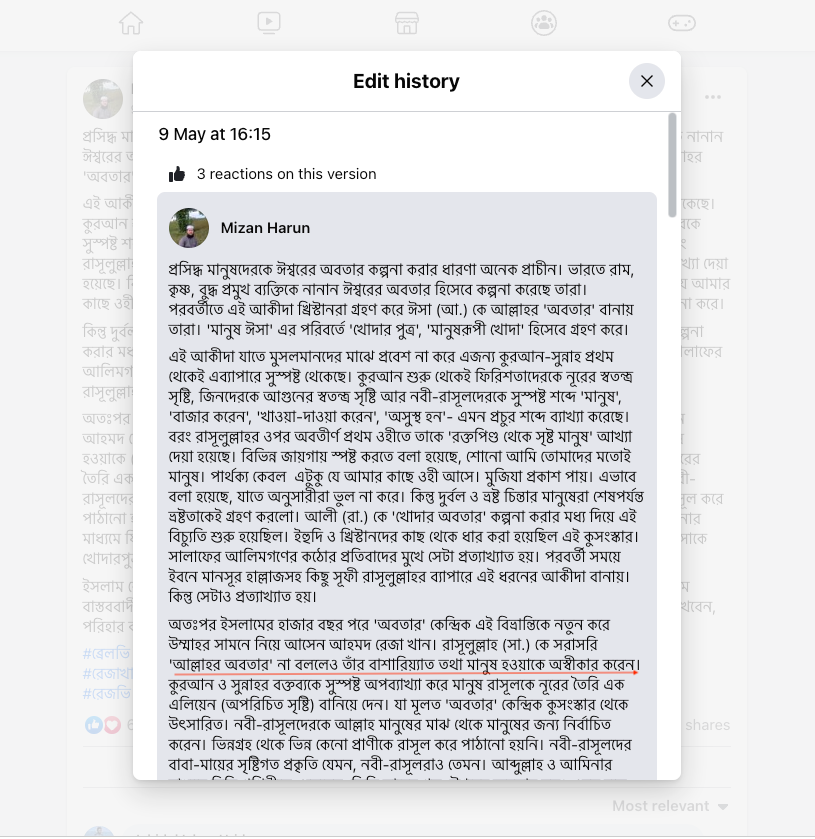 এখানে আমহদ রিদ্বা খানের বিরুদ্ধে মিজান হারুনের মূল অভিযোগ ছিলো, আহমদ রিদ্বা খান নবীজী সাল্লাল্লাহু আলাইহি ওয়াসাল্লামের বাশারিয়্যাত তথা মানুষ হওয়াকে অস্বীকার করেন। প্রথম দিকে সরাসরি এভাবেই তিনি লিখেছিলেন। পরে ব্রাকেটে (প্রকারান্তরে) কথাটি যোগ করেছেন। শুরুতে আমি সরাসরি অস্বীকার করার বিষয়টি দেখি। পরবর্তীতে তিনি যে পোস্ট এডিট করেছেন, সেটিও তার পোস্টের হিস্টোরি থেকে স্পষ্ট। পোস্টের ভুল সংশোধন করে এডিট করাটা কোন অন্যায় নয়। কিন্তু সরাসরি আহমদ রিদ্বা খানের বিরুদ্ধে নবীজী সাল্লাল্লাহু আলাইহি ওয়াসাল্লামের বাশারিয়াত অস্বীকার করার মতো বিষয়টির অভিযোগ করার আগে বিষয়টি উনার তাহকিক করা প্রয়োজন ছিলো। কিন্তু উনার বর্ণনা ভঙ্গি এবং এডিট থেকে বোঝা যাচ্ছে পোস্টের আগে ও পরে তিনি বিষয়টি সঠিকভাবে যাচাই করেননি। এখানে মিজান হারুন যেভাবে তার প্রাথমিক বক্তব্য সংশোধন করেছেন, আমরা আশাবাদি তিনি আমাদের পর্যালোচনার বাকী বিষয়ের ভুল থেকেও সংশোধনের উদ্দোগ নিবেন। এডিট হিস্টোরির স্ক্রিনশট: