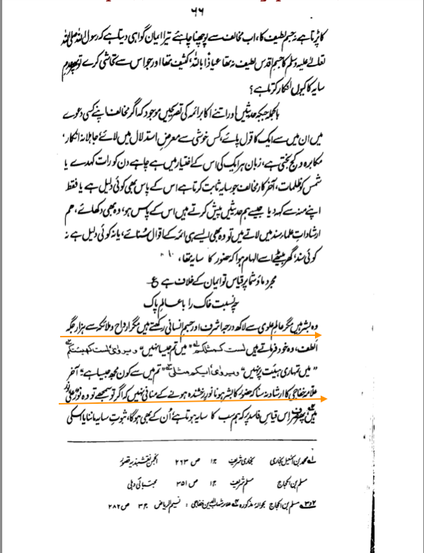 একই ধরণের কথা আহমদ রিদ্বা খান বেরেলভী নূর ও বাশার সংক্রান্ত তার বিভিন্ন কিতাবে উল্লেখ করেছেন। আমি তার কিতাব থেকে কিছু উদ্ধৃতি উল্লেখ করছি। আহমদ রিদ্বা খান বেরেলভীর মাজমুয়ায়ে রাসাইলে নূর নামে নূর ও বাশার সংক্রান্ত সবগুলো পুস্তক সংকলন করে ছাপা হয়েছে। এই কিতাবের ৬৬ পৃষ্ঠায় তিনি লিখেছেন,
