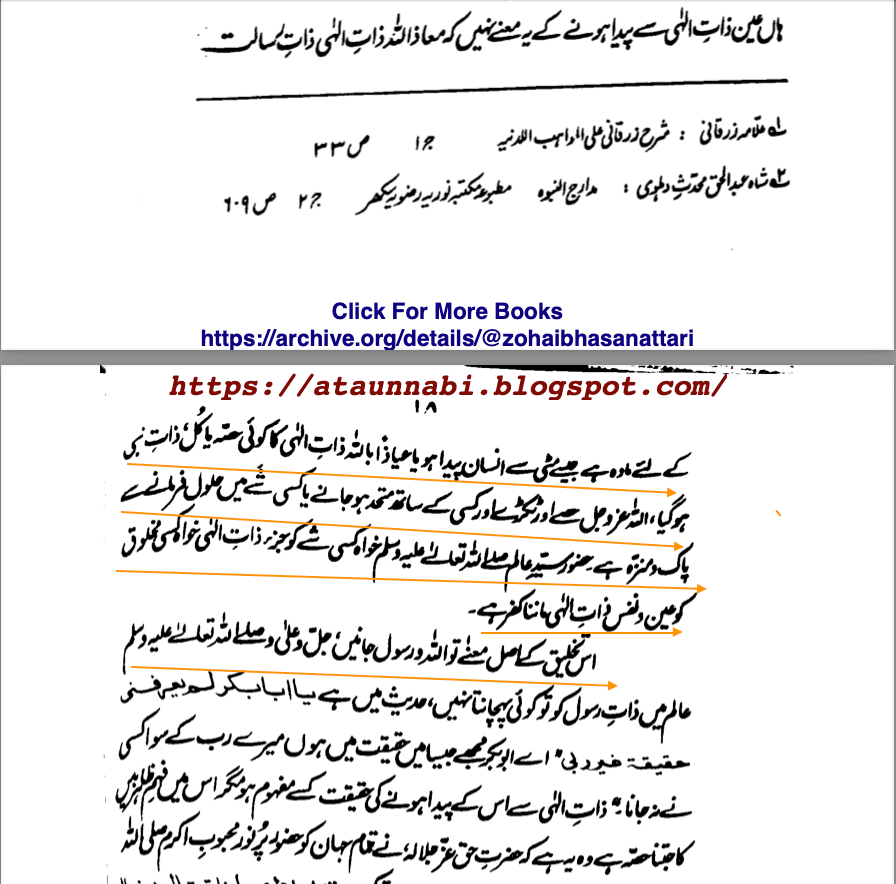 “ আল্লাহর নূর থেকে সৃষ্টি হয়েছেন এর অর্থ কখনও এটি নয় যে, নাউজুবিল্লাহ নবীজীর সৃষ্টির মৌল উপাদান হলেন আল্লাহ তায়ালা। যেমন, মাটি থেকে মানুষ সৃষ্টি হয়েছে বললে বোঝা যায়। নাউজুবিল্লাহ এটাও উদ্দেশ্য নয় যে, আল্লাহর সত্ত্বা বা সত্ত্বার খন্ডিত কিছু নবীজীর অংশ হয়ে গিয়েছেন। বরং আল্লাহ তায়ালা তো অংশ বিশিষ্ট হওয়া, কোন কিছুর সাথে মিলিত হওয়া বা কোন কিছুর মাঝে অনুপ্রবেশ থেকে সম্পূর্ণ মুক্ত ও পবিত্র। হুজুর সাল্লাল্লাহু আলাইহি ওয়াসাল্লাম হোক কিংবা অন্য কোন কিছুকে আল্লাহর সত্ত্বার অংশ মনে করা কিংবা কোন সৃষ্টিকে হুবহু আল্লাহর সত্ত্বা বা সত্ত্বার অংশ মনে করা কুফুর”