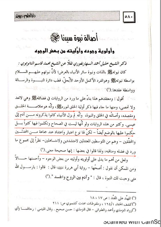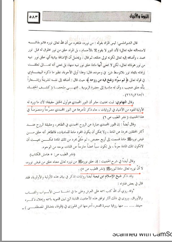 “হযরত জাবের রা: এর হাদীস থেকে স্পষ্ট যে নূরে মুহাম্মাদী হলো বাস্তবে প্রথম সৃষ্টি।” (নাশরুত তিব্ব, পৃ: ৬)