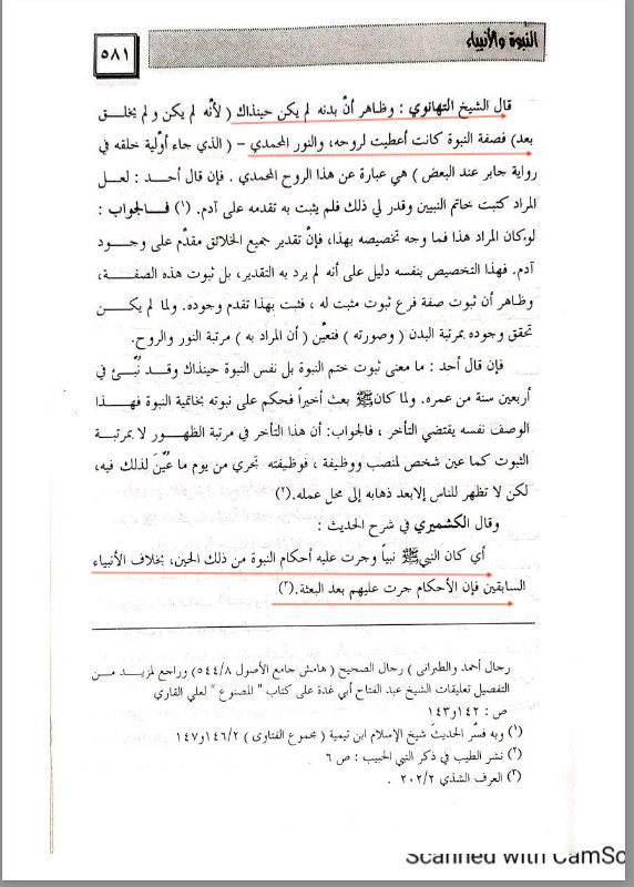 “ স্পষ্টত: তখন নবীজী সাল্লাল্লাহু আলাইহি ওয়াসাল্লামের দেহ মোবারক তখন ছিলো না। সুতরাং নবুওয়াতের গুণটি তখন নবীজীর রুহ ও নূরে মুহাম্মাদিকে দেয়া হয়েছিল”।
