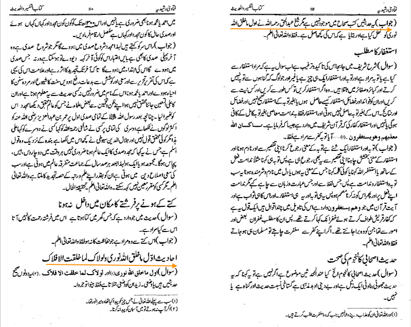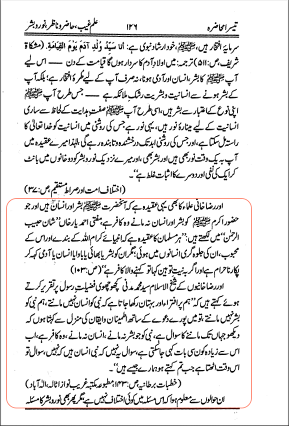 (মুহাদারাতে ইলমিয়া বর মাউদুয়ে রদ্দে রেজাখানিয়াত, পৃ: ১২৫, ১২৬)