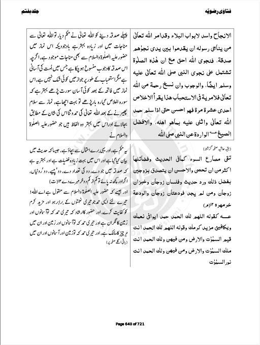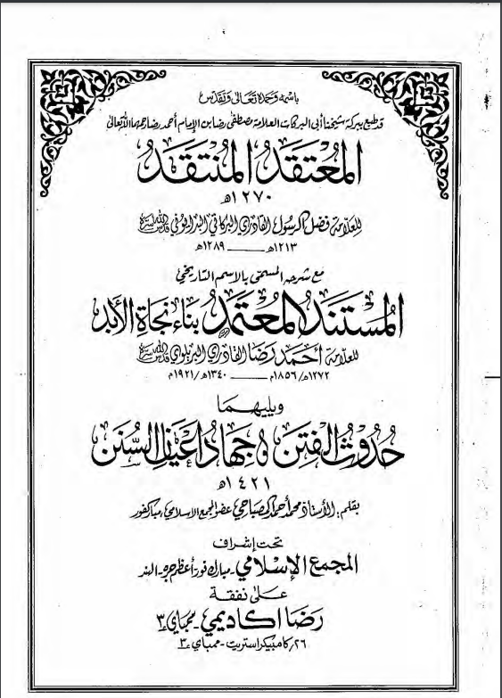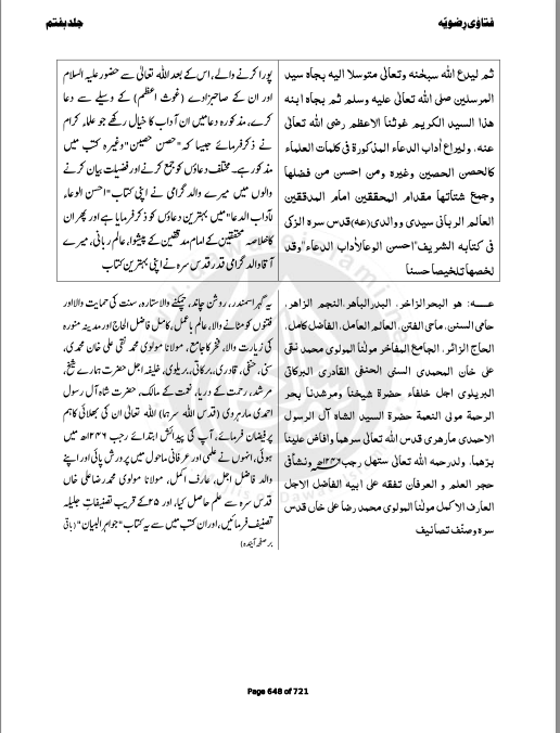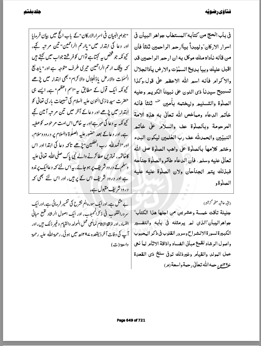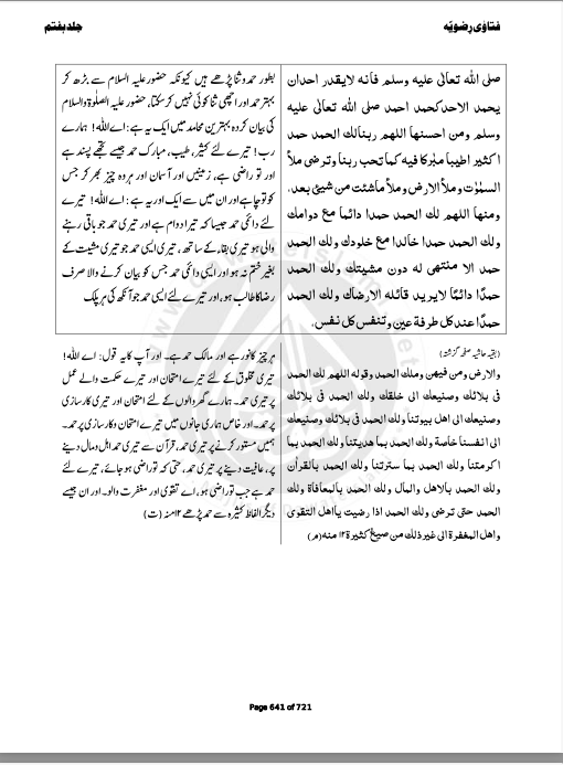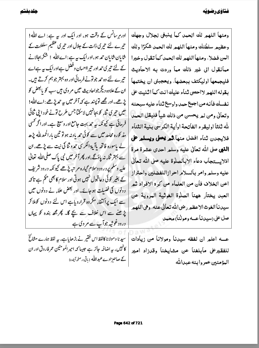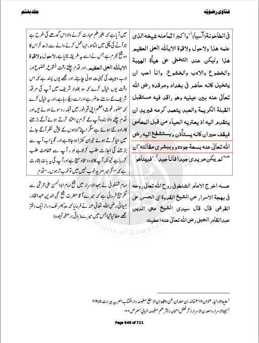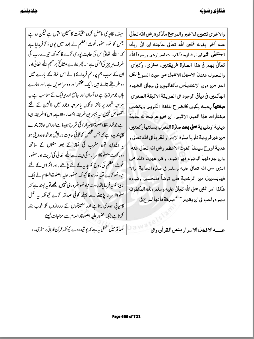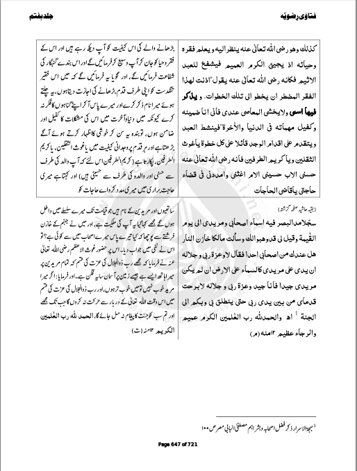 (ফতোয়ায়ে রিদাভিয়্যা, খ: ৭, পৃ: ৬৩৭-৬৩৯)