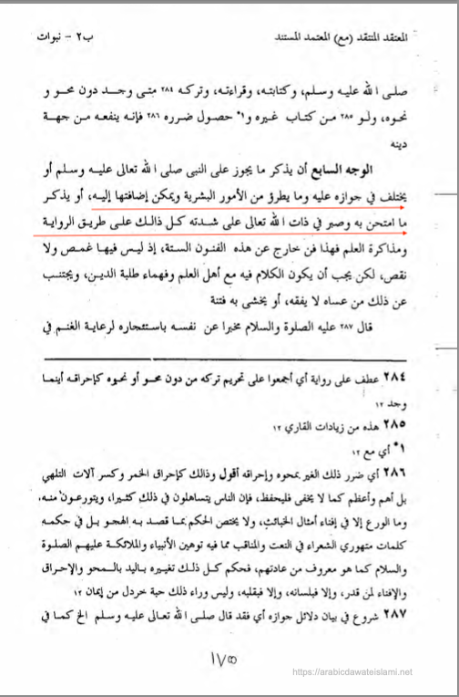 ১। মাওলানা ফজলে রাসূল বাদায়ূনীর বিখ্যাত কিতাব আল-মু’তাকাদুল মুনতাকাদ এ নবীজী সাল্লাল্লাহু আলাইহি ওয়াসাল্লামের জন্য কোনটি আবশ্যকীয়, কোনটি নবীজীর জন্য অসম্ভব এবং কোনটি জায়েজ এ বিষয়ে বিস্তারিত আলোচনা করেছেন। আলোচনার এক পর্যায়ে তিনি বলেন, নবীজী সাল্লাল্লাহু আলাইহি ওয়াসাল্লামের জন্য সেসব বিষয় হওয়া জায়েজ যেগুলো মানবীয় বৈশিষ্ট্যের সাথে সম্পর্কিত। যেমন, আল্লাহর পক্ষ থেকে বিভিন্ন পরীক্ষা, দু:খ-দুর্দশার, অসুস্থ্যতা ইত্যাদির সম্মুখীন হয়েছেন। একইভাবে বকরী চরান, ইয়াতীম হওয়া। সেই সাথে দুনিয়াবী যেসব কাজের সাথে তিনি যুক্ত ছিলেন সেগুলোও মূলত: নবীজীর মর্যাদার বিষয়। যেমন, তার দুনিয়ার প্রতি অনাসক্তি, যুহদ, আহার, বস্ত্র, বাস-স্থান, কষ্ট-ক্লেশ সবই মানবীয় বৈশিষ্ট্য হিসেবে নবীজীর সম্মান ও মর্যাদার বিষয়। এগুলো নবীজীর নবী হওয়ার বিরোধী নয়।