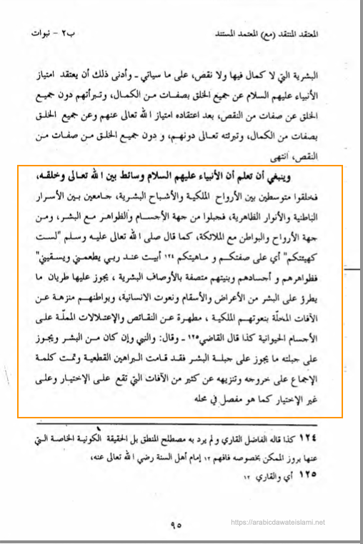 “জেনে রাখা দরকার যে, আম্বিয়াগণ হলেন আল্লাহ ও বান্দার মাঝে মধ্যস্ততাকারী। এজন্য তাদেরকে ফেরেশতাদের রুহানিয়াত ও মানবীয় উভয় গুণের মধ্যবর্তী স্তর হিসেবে সৃষ্টি করা হয়েছে। তারা আল্লাহর গুপ্ত রহস্যের অধিকারী, প্রকাশ্য নূরানিয়াতের আধার। সুতরাং তারা দেহ ও প্রকাশ্য শরীরের বিবেচনায় মানুষ, তবে রুহ বা আধ্যাত্মিকতার বিবেচনায় ফেরেশতাদের সদৃশ। এজন্য নবীজী সাল্লাল্লাহু আলাইহি ওয়াসাল্লাম বলেছেন,