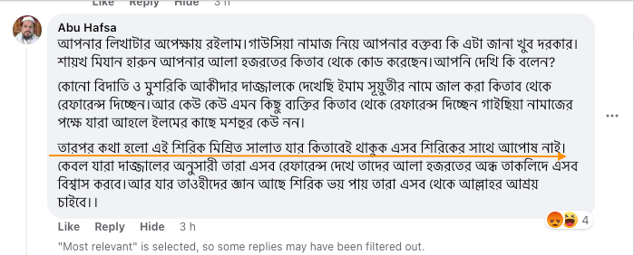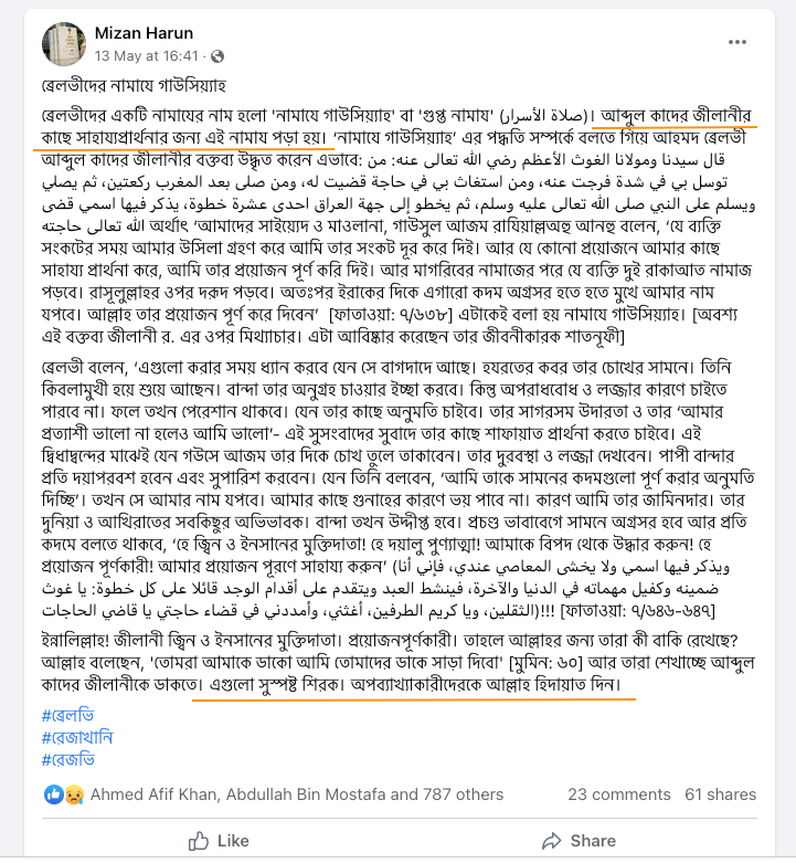 “ইন্নালিল্লাহ! জীলানী জ্বিন ও ইনসানের মুক্তিদাতা। প্রয়োজনপূর্ণকারী। তাহলে আল্লাহর জন্য তারা কী বাকি রেখেছে? আল্লাহ বলেছেন, 'তোমরা আমাকে ডাকো আমি তোমাদের ডাকে সাড়া দিবো' [মুমিন: ৬০] আর তারা শেখাচ্ছে আব্দুল কাদের জীলানীকে ডাকতে। এগুলো সুস্পষ্ট শিরক। অপব্যাখ্যাকারীদেরকে আল্লাহ হিদায়াত দিন।”