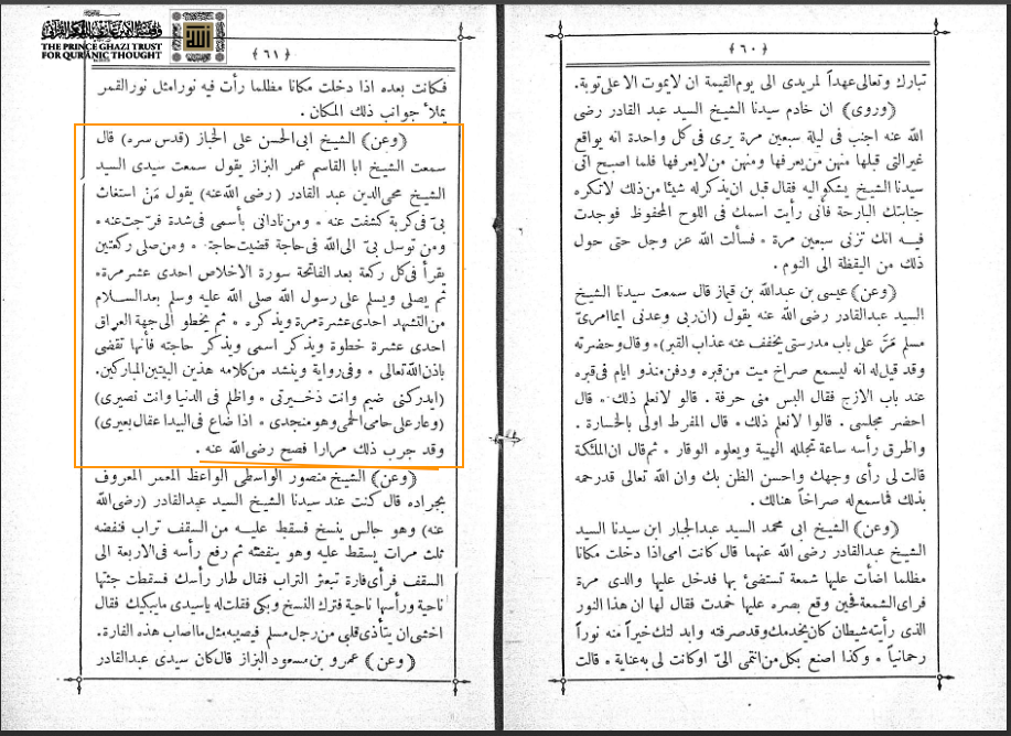 “ শায়খ আবুল হাসান আলী আল-খাব্বাজ থেকে বর্ণিত, তিনি বলেন, আমি শায়খ আবুল কাসেম উমর আল-বাজ্জাজকে বলতে শুনেছি, তিনি বলেন, আমি সাইয়্যিদি মহিউদ্দীন আব্দুল কাদেরকে বলতে শুনেছি, যে ব্যক্তি কোন বিপদাপদে আমার মাধ্যমে সাহায্য চাইবে তার বিপদ দূর করা হবে, কোন মুসীবতে কেউ আমার নামে ডাকলে তার মুসীবতের সমাধান করা হবে। যে আমার ওসিলা করে কোন প্রয়োজনে আল্লাহর কাছে সাহায্য চাইবে তার প্রয়োজন পূরণ করা হবে। যে ব্যক্তি দু’রাকাত নামাজ আদায় করবে, প্রতি রাকাতে সূরা ফাতিহার পর এগারবার সূরা ইখলাস পাঠ করবে, নামাজ শেষে নবীজীর উপর এগার বার দুরুদ-সালাম পেশ করবে এবং আল্লাহর রাসূলের কথা স্মরণ করবে, অত:পর ইরাকের দিকে এগার কদম অগ্রসর হবে এবং আমার নাম স্মরণ করে তার প্রয়োজনের কথা স্মরণ করবে, আল্লাহর অনুমতিতে তার প্রয়োজন পূরণ করা হবে।”