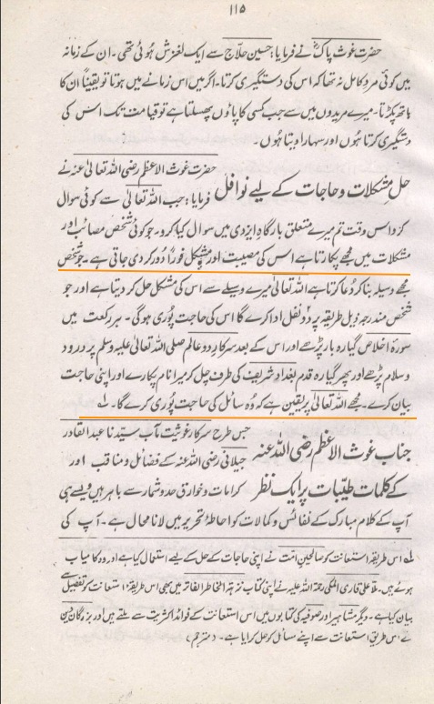 ৩। আব্দুল কাদের জিলানীর নাম নেয়ার কথা বললেও মূল প্রয়োজন পূরণ করবেন আল্লাহ তায়ালা। যা খোদ আব্দুল কাদের জিলানী নিজে বলেছেন এবং এটাকেই আহমদ রিদ্বা খান তার মূল সিদ্ধান্ত হিসেবে গ্রহণ করেছেন। আমরা উপরে দেখিয়েছি, এই পদ্ধতির বিস্তারিত বিবরণের ক্ষেত্রেও আহমদ রিদ্বা খান চূড়ান্ত প্রয়োজন পূরণকারী হিসেবে আল্লাহ তায়ালাকেই সাব্যস্ত করেছেন এবং আল্লাহর কাছে দু’য়া করার বিভিন্ন পদ্ধতি ও নিয়ম শিখিয়েছেন। এবং এও শর্ত করে দিয়েছেন যে, আদব ও ইহতিরামের সাথে, তাড়াহুড়ো না করে, গোনাহ ও আত্মীয়তার সম্পর্ক ছিন্ন না করে এভাবে দু’য়া করলে সেটি কবুল হওয়ার সম্ভাবনা থাকে। এখানে যাদের ওসিলা করা হচ্ছে কিংবা যাদেরকে সুপারিশকারী মনে করা হচ্ছে, তাদের কাউকেই সুপারিশের ক্ষেত্রেও স্বাধীন ও স্বয়ংসম্পূর্ণ মনে করা হচ্ছে না যে, আল্লাহ তায়ালা চান অথবা না চান, নাউজুবিল্লাহ আব্দুল কাদের জিলানীর কাছে চাইলেই সেটা পূরণ হবে। এধরণের শিরকী সুপারিশ বা ওসিলাও এখানে পাওয়া যাচ্ছে না। বরং নামাজ, দু’য়া, ইস্তিগাছা, দুরুদ ও সালাম সব কিছুর পরে প্রয়োজন পূরণের বিষয়টি আল্লাহর উপর ছেড়ে দেয়া হচ্ছে। তিনি বান্দার দু’য়া কবুলও করতে পারেন। নাও করতে পারেন। তবে সঠিক পদ্ধতিতে করলে আদব ও ইহতিরামের সাথে করলে দু’য়া কবুলের সম্ভাবনা থাকে।