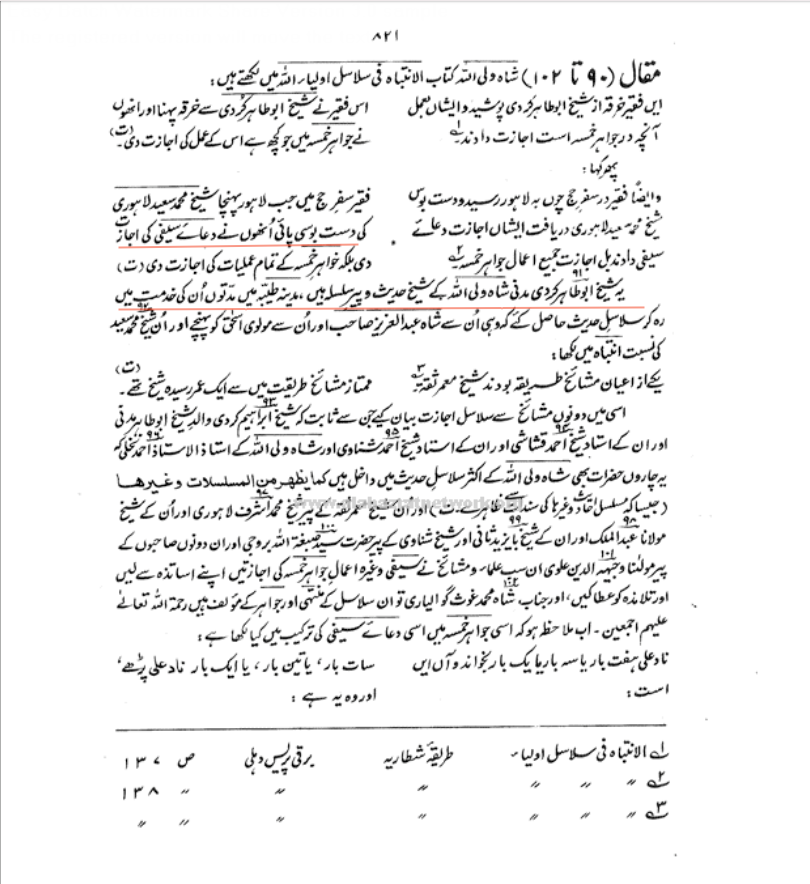 এই ইন্তিবাহ কিতাবেই জাওয়াহিরে খামসা ও সাইফী দু’য়ার সনদ উল্লেখ করা হয়েছে। এই সনদে শায়েখ আবু তাহের কুর্দির পিতা শায়েখ ইব্রাহীম কুর্দি, তার উস্তায শায়েখ আহমদ কাশশাশী, তার উস্তায শায়েখ আহমদ শাননাবী রয়েছেন। আরেক সনদে শাহ ওয়ালিউল্লাহর দাদা উস্তায় আহমদ নাখলী রয়েছেন। মোটকথা এই চারজন শাহ ওয়ালিউল্লাহর অধিকাংশ হাদীসের সনদেও রয়েছে। তার মুসালসাল হাদীসের সনদগুলো বিশ্লেষণ করলে এমনটাই প্রতিয়মান হয়।