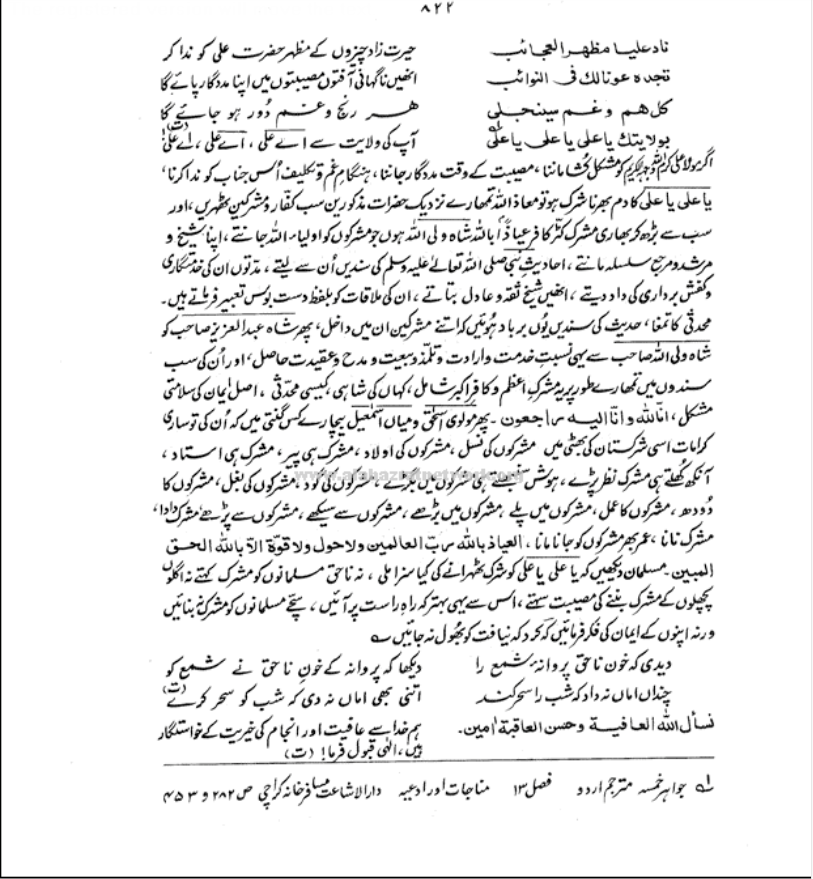 আলী রাজিয়াল্লাহু কে মুশকিল কুশা বা বিদাপদে সাহায্যকারী বিশ্বাস করা, মুসীবতে উদ্ধারকারী বিশ্বাস করা, চিন্তা - পেরেশানীর সময় ইয়া আলী ইয়া আলী বলে আহ্বান করা সরাসরি শিরক হয়, তাহলে তোমাদের নিকট উপরের সমস্ত আলিম ও মাশায়েখ কাফের ও মুশরিক হওয়ার কথা। সবচেয়ে বড় মুশরিক ও কট্রর কাফের হওয়ার কথা নাউজুবিল্লাহ শাহ ওয়ালিউল্লাহ রহ। তিনি তো এসব মুশরিকদেরকে ওলী মনে করতেন, নিজের শায়েখ, উস্তায, পীর ও হাদীস ও তাসাউফের সনদ মনে করেন তাদেরকে। নবীজীর হাদীসের সনদ নিয়েছেন তাদের কাছ থেকে। লম্বা সময় তাদের খেদমতে আত্মনিয়োগ করেছেন। তাদের শায়খ, সিকাহ, আমানতদার হিসেবে উল্লেখ করেছেন। তাদের সাক্ষাৎকে হস্ত চুম্মনের সৌভাগ্য বলে উল্লেখ করেছেন।
